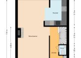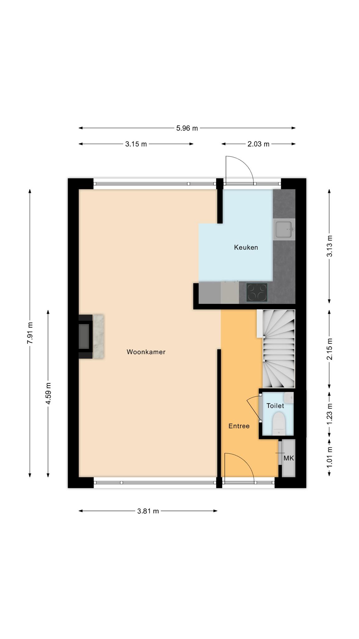 Entree, hal, garderoberuimte, meterkast, toiletruimte met toilet en fonteintje, vaste trap naar de eerste verdieping en doorgang naar de woonkamer en open keuken.
