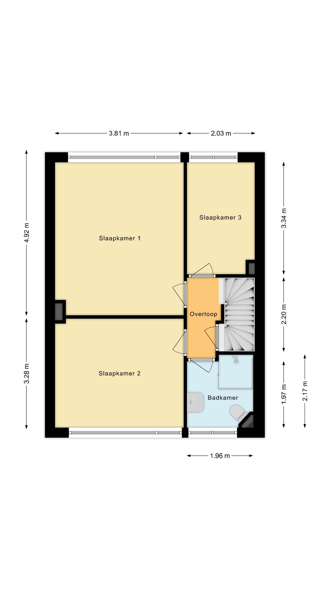 Vaste trap naar de eerste verdieping met overloop, toegang tot 3 slaapkamers en een badkamer.