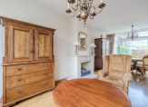 De woonkamer met open haard kijkt uit over het groene plein aan de voorzijde. Aan de achterzijde is het eetgedeelte gesitueerd. De open keuken ligt eveneens aan de achterzijde en is voorzien van diverse inbouwapparatuur zoals een koelkast, vaatwasmachine, keramische kookplaat, afzuiging en combi- oven/magnetron. De keuken biedt toegang tot de ruime, goed onderhouden achtertuin.