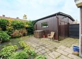 Verzorgde voortuin op het noorden met oprit naar de houten garage. De zonnige achtertuin is gelegen op het zuiden en biedt zowel terrassen als groen.